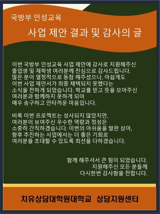2026 | [치유상담대학원대학교]국방부 인성교육 사업제안 결과 및 감사의 글 페이지 정보 작성자 관리자 작성일26-04-20 11:58 조회14회 댓글0건 첨부파일 감사의 글-복사.pdf 관련링크 다음글 목록 본문 다음글 목록
