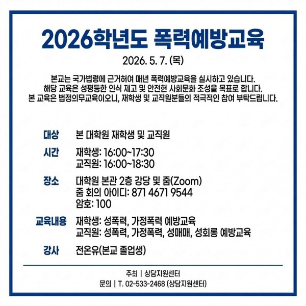 2026 | [상담지원센터] 2026년 폭력예방교육 안내(재학생 및 교직원 필수교육)_2026.5.7. 목요일